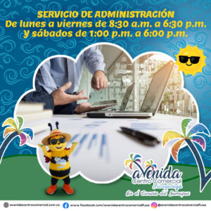 Servicio de Administración: Contamos con profesionales en las diferentes áreas de mantenimiento, seguridad, operaciones, mercadeo, financiera y gerencia, quienes con gusto los atenderán en el horario de lunes a viernes de 8:30 am a 6:30 pm Sábados, de 1:00 pm a 6:00 pm.