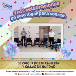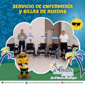 ENFERMERIA Y PRESTAMO DE SILLAS DE RUEDAS: Enfermeros certificados y con los equipos indispensables para prestar los primeros auxilios comunicados permanentemente con una red de ambulancias. Contamos con sillas de ruedas que se suministran a personas con discapacidad, adultos mayores o con alguna complicación de salud para tener mejor movilización en el centro comercial. • Servicio de Enfermería de Lunes a Domingo de 11:00 am a 8:00 pm. • Servicio de préstamo de sillas de ruedas de Lunes a Domingo de 6:00 am a 10:00 pm.